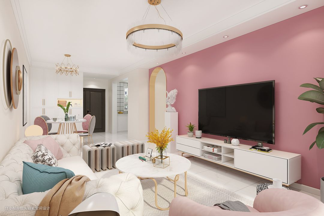 电视背景墙采用整体的粉色墙面作为基调,精调的高级粉充满了小资的浪漫幻想,又不至于太过轻佻俗气。搭配造型简单时尚的白色电视柜与艺术感十足的石膏雕像饰品,营造出轻松明快且少女心十足的客厅氛围。