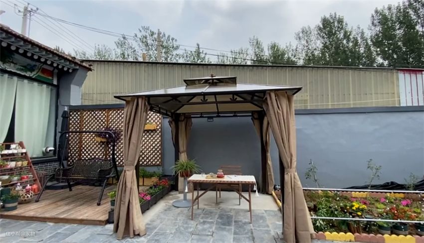 院落一侧规划出一片休闲区,底部用木板搭建出地台,搭建了凉棚,摆放了秋千和座椅,平日可坐在这里观景休息,自然美好;