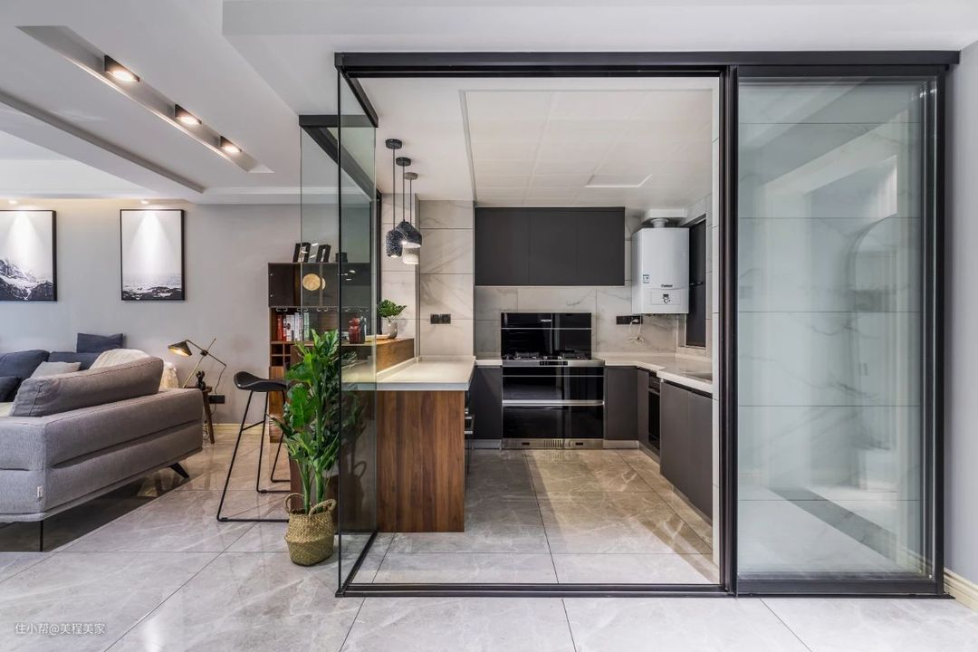 原始结构的厨房可以将门洞扩至最大,并用玻璃隔断替代,厨房在工作的时候可以不用考虑太多的隐私,所以可以选用通透度较高的玻璃隔断,让光线充分进入,美观又实用。