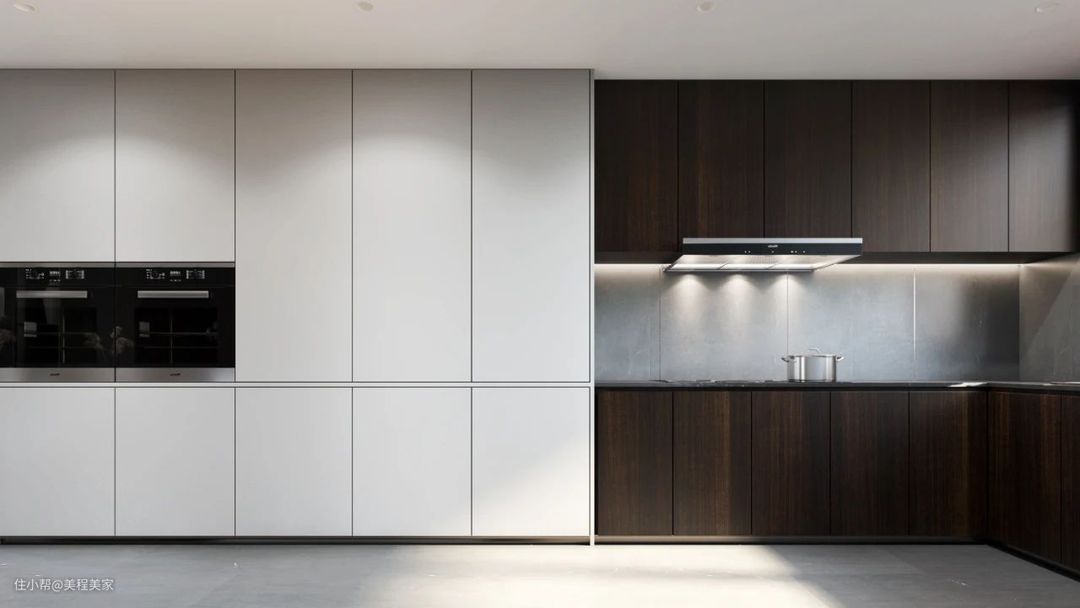 采光不够的时候可以考虑不同区域的灯光设计来解决,厨房常见的是一个平板灯走天下。除此之外,在橱柜之间做灯带设计也是很有必要的。