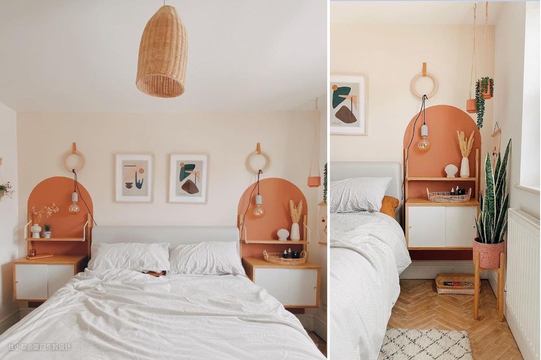 看腻家裡的摆设,又不想大动工程装潢,不妨用「色彩」与「几何色块」,为房间的一角创造新亮点,藉由涂料为空间进行局部轻装修,营造焕然一新的感觉。近来,IG兴起一波使用圆拱造型色块点缀居家的风潮,勾勒场域活力、视觉层次与趣味感。像是使用粉橘色圆拱色块,点缀两侧床边柜,富有造型也不会太过梦幻,让房间散发简约温馨且柔美的氛围。