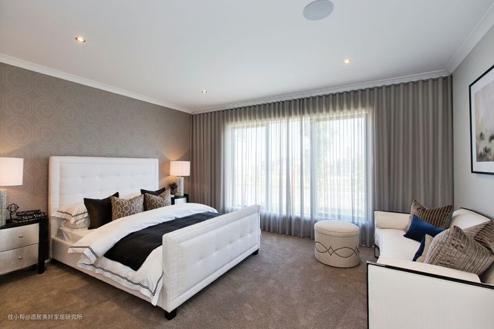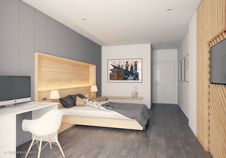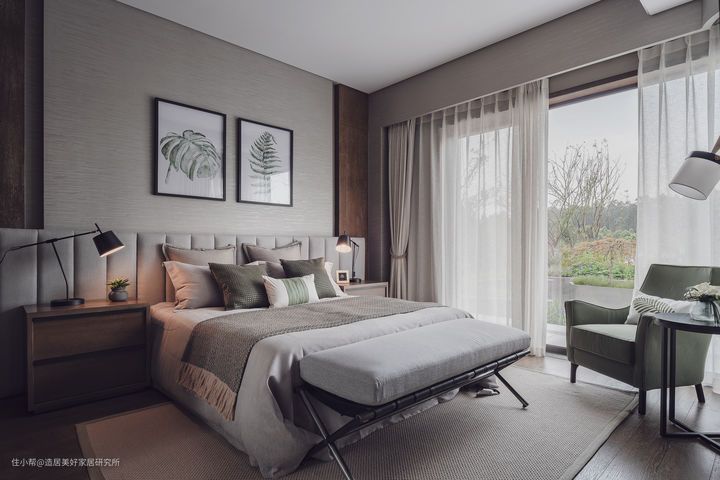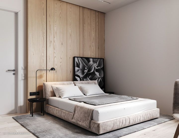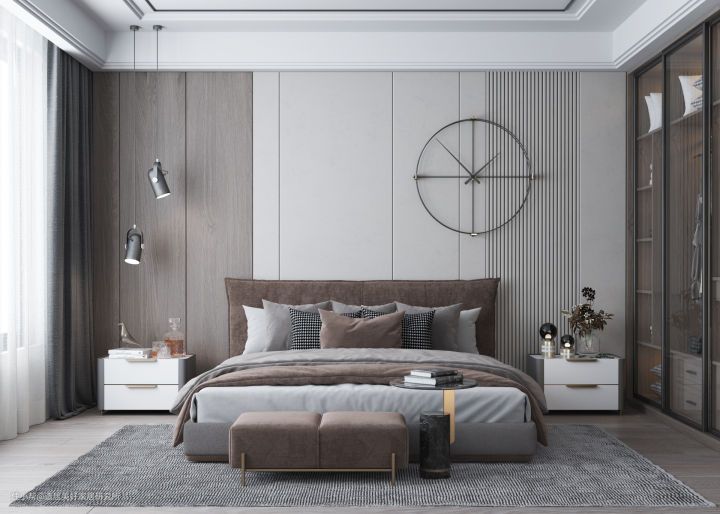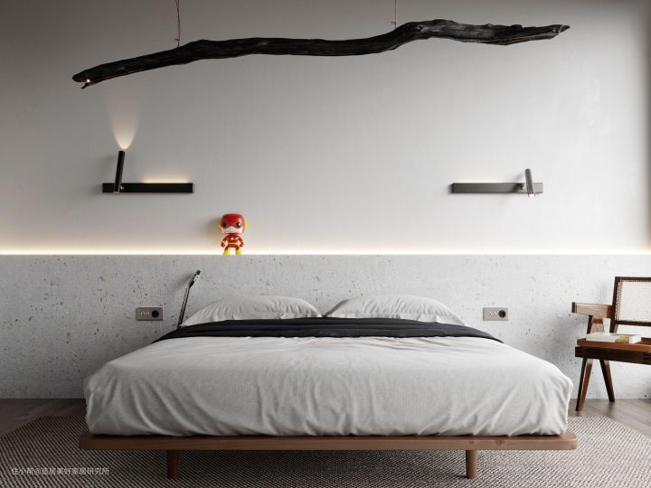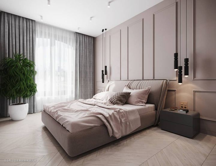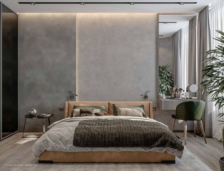 单一材质装饰的背景墙,或许会让你觉得单调,特别是在大空间中,会显得较为空荡,那么可以选择两种或者多种材质混合搭配,营造出层次丰富的空间氛围,也能提升卧室的美观度与舒适度。