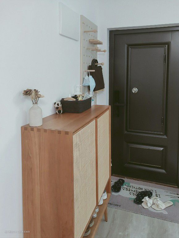 从入户门进来,没有真正的玄关,布置了一个比较小的鞋柜,足够家用。旁边买了一个非常实用的孔板,价值非常高,可以轻松挂一些小物件和东西,更好的分类存放。我不喜欢顶天立地的鞋柜。按照户型布局,空间比较宽敞,不会让人感到压抑。
