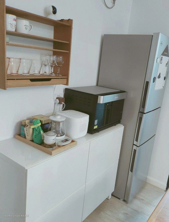 餐厅旁边有一个白色的餐边柜,可以提供很多储物空间,包括一些常用的物品。墙上安装了隔板,可以放一些酒杯。非常好。旁边有冰箱,不用放在厨房,可以避免油烟污染,挺好的。