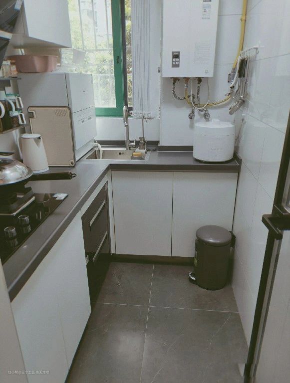 厨房只有巴掌大的空间,水槽也没那么合理。如果能排到右边,用起来会更合适,更方便。地板铺灰色瓷砖,非常耐脏,方便清洗。