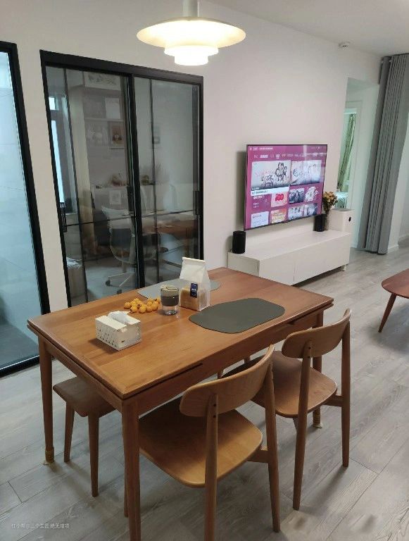 餐厅设有方形原木餐桌,占据了适当的空间和位置,比圆形餐桌更适合移动和灵活使用。可以看出电视墙没有做任何造型,但考虑到室内空间更合适。如果不做电视墙,可以省很多钱,挺好的。对于我们现在的很多年轻人来说,不做电视墙更让人满足。