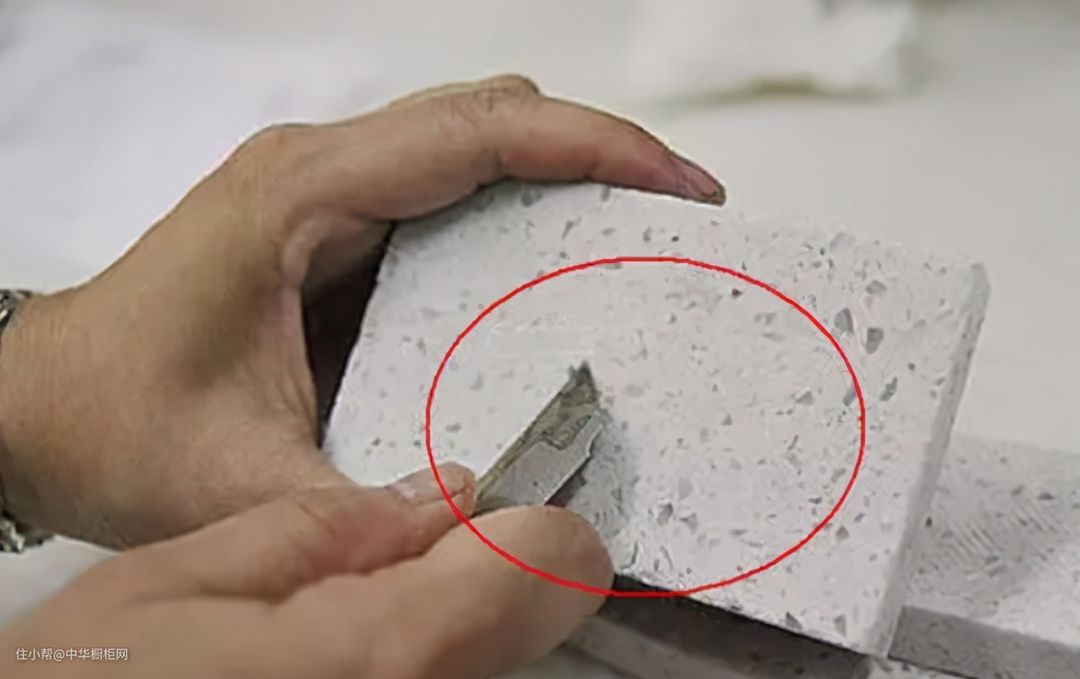 另外一种制作工艺是浇铸,它做出来的石英石质量较轻,莫氏硬度仅有4,菜刀一划便能留下痕迹,因此属于假的石英石台面。
