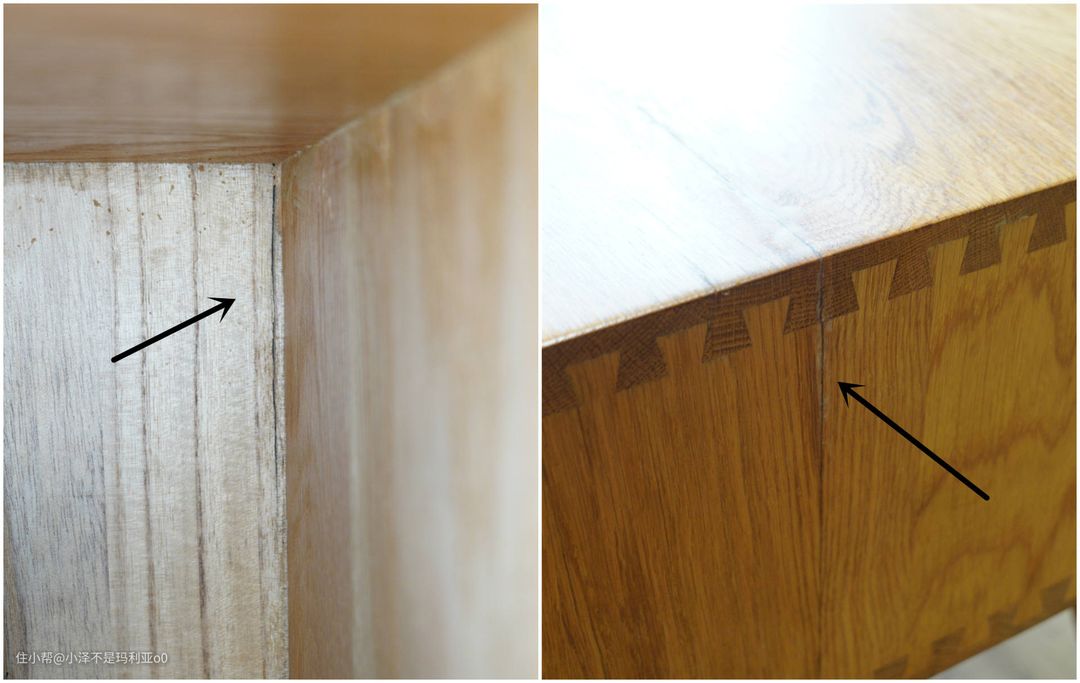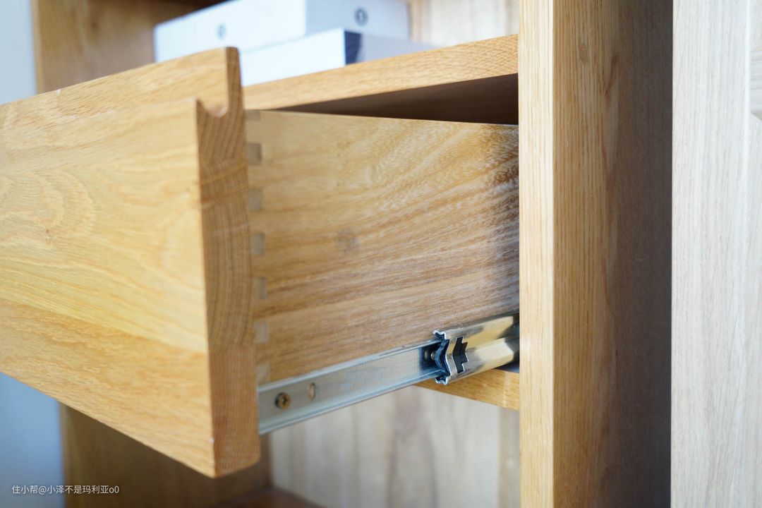 柜体两侧使用的是单榫卯结构,另外抽屉以及背板使用的也是足够厚实的白橡木材质,用料方面还是足够令人满意的。