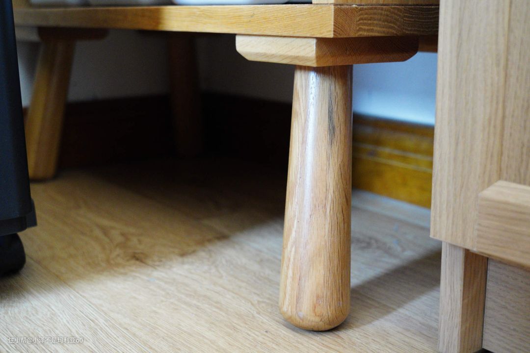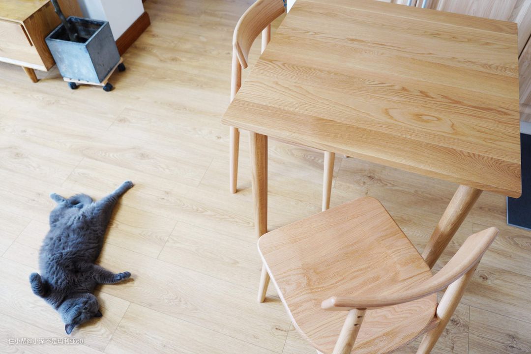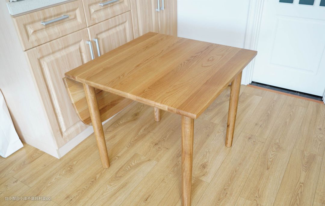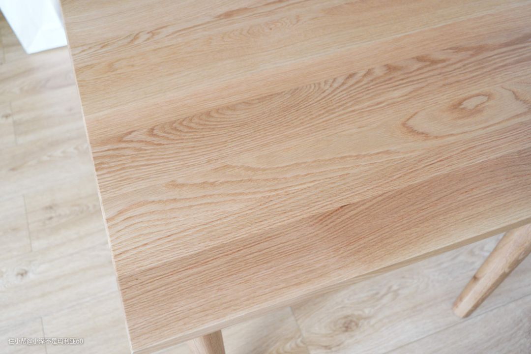 方形餐桌尺寸为80cm×80cm,整桌都是北美fas级白橡木制作。桌面厚度2.5公分,桌腿直径约5.8公分,用料方面还是相当扎实。
