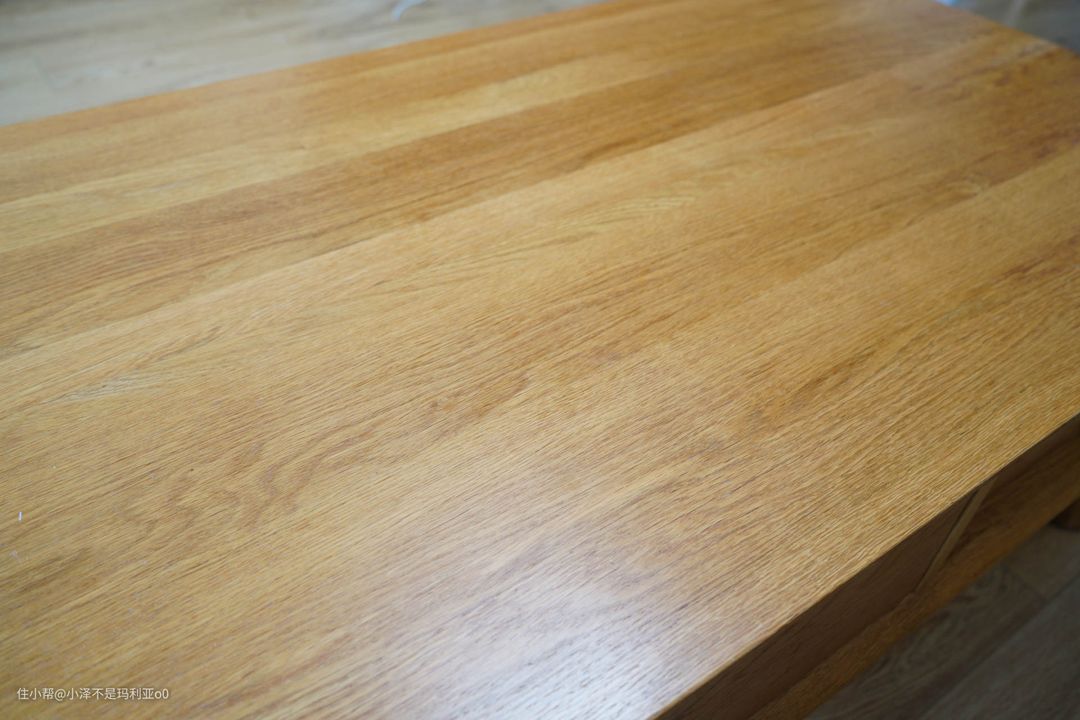 尽管表面还是使用十公分左右的木板拼接而成,但稳定性会比整块木料更好。白橡木木纹清晰自然,质地坚硬。放置了半年左右的时间之后,这款电视柜的颜色也有最初的黄白色慢慢变为黄褐色。我会每2个月左右使用木蜡油进行保养,让它的表面保持油亮温润的光泽感。