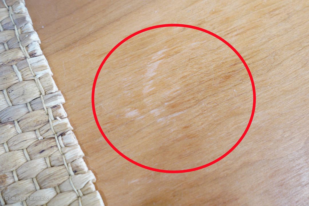 图中红圈内的部分就是我将没有擦干的水杯放上去,直接破坏了家具表面的漆面。幸好我发现的比较及时,并且迅速做了补救工作,否则很可能造成开裂或者起皮现象。