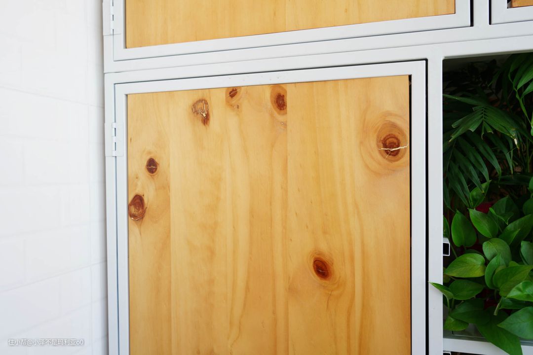 收纳柜是整装发货,送货入户,第一眼看过去就被这满柜门的疖疤所吸引,顿时心里凉了半截,不过好在木纹还算自然美观,跟阳台墙上的樟子松扣板搭配起来还是挺和谐的。