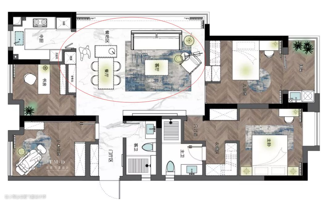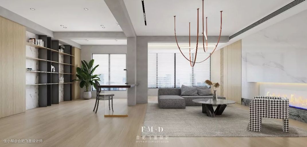 三分式的大横厅设计,划分出来的每个功能区都有各自的亮点。