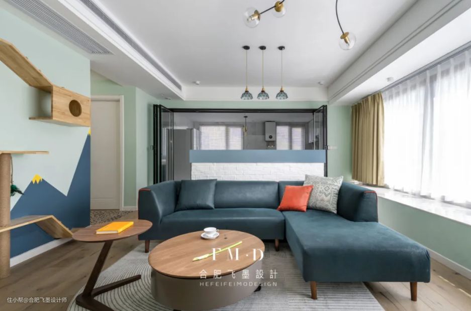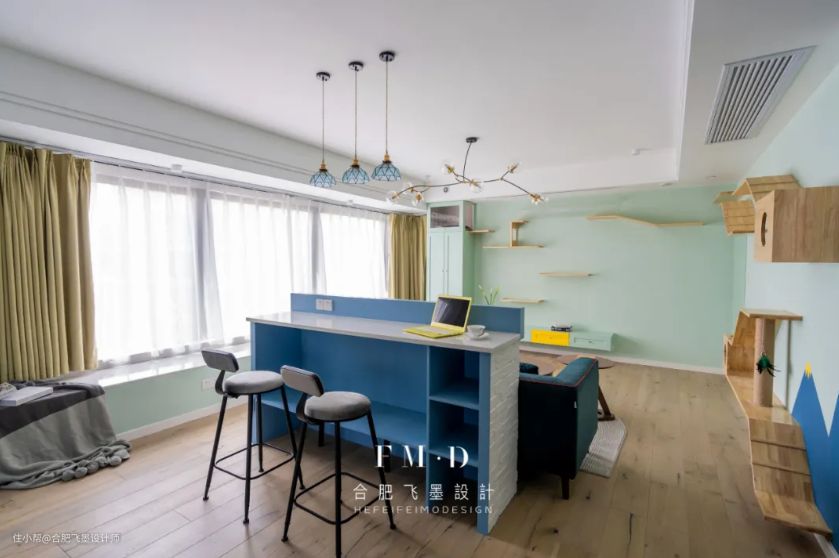 客厅:因为夫妻俩都喜欢猫猫,因此在客厅去电视化的基础上,选择猫爬架装饰电视墙,利用投影幕布代替电视,让客厅功能升级,实现新颖、个性的装饰效果。