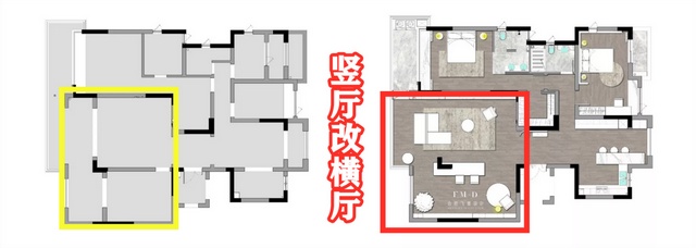装修小白们如何判定自家户型属不属于横厅呢?其实很简单,就是你家开间大于进深,就属于横厅,反过来就是竖厅了。当然装修的可能性更多,即使你家原始户型不是横厅,也可以改成横厅,像这样: