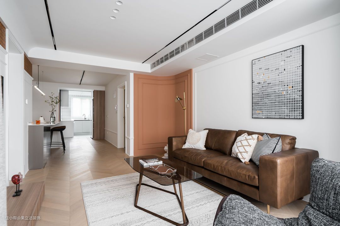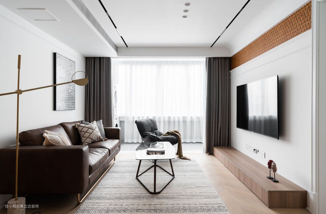 背景墙的橙色羽毛壁纸是客厅最鲜艳的点缀。