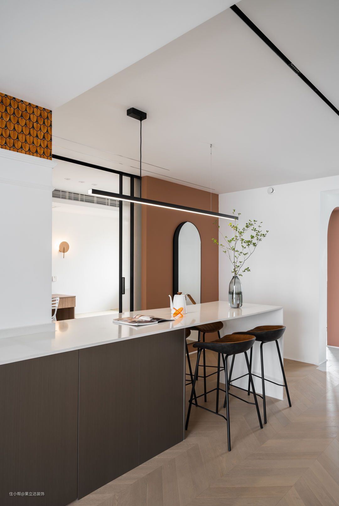 位于餐厅背后的是我们的玄关造型墙。我在这堵墙体里暗藏了一道双联的玻璃移门。打开的时候,书房和餐厅就会联通在一起,空间一下子就会被放大起来,关上就是两个互不号扰的独立空间。