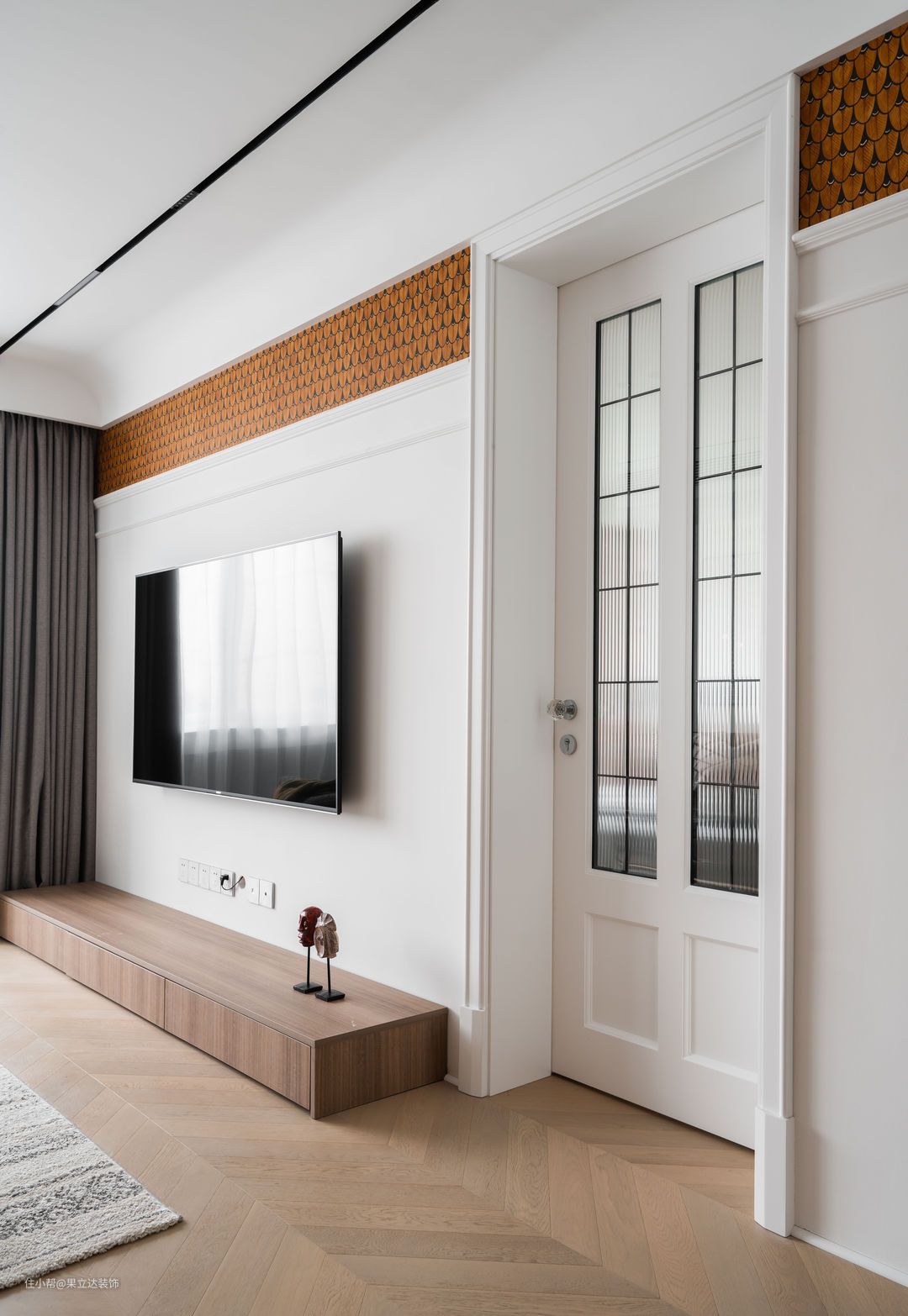 定制了主卧房门,房门中间是双层的长虹玻璃,在保护了主卧隐私的前提下,增加了整体质感和透光性。
