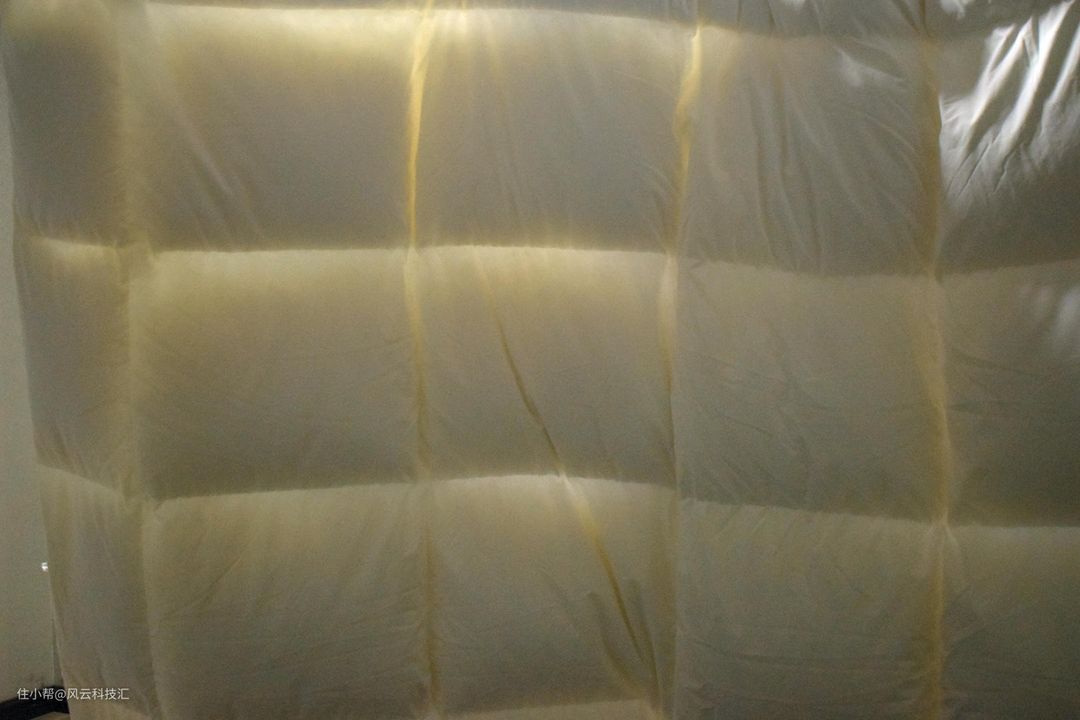 羽绒类纺织品充绒是否均匀也直接影响保暖效果,如果充绒不均匀,那鹅绒被的品质和保暖性就会大打折扣,这款鹅绒被采了3D立衬太空舱工艺,内立衬设计更加锁温,在灯光下看,每格充绒都很均匀、饱满,盖在身上也从头暖到脚。