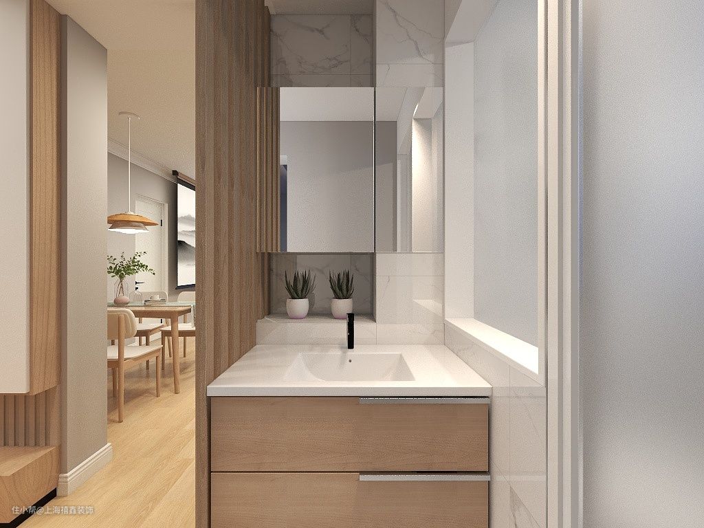 【卫生间】洗漱池外放满足了干湿分离需求的同时又可以减轻卫生间的空间压力。本次案例中的外置洗漱池为了更加美观,所以在最外侧设计了格栅作为隔断,既可以让单独的小空间也能够独立又增加欣赏性。