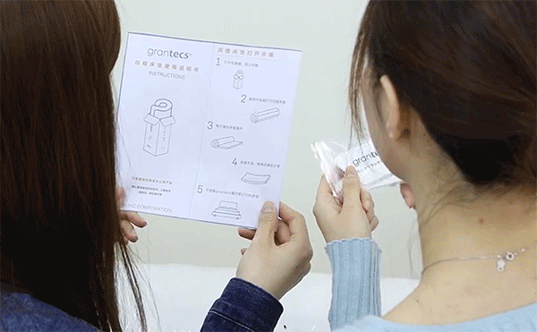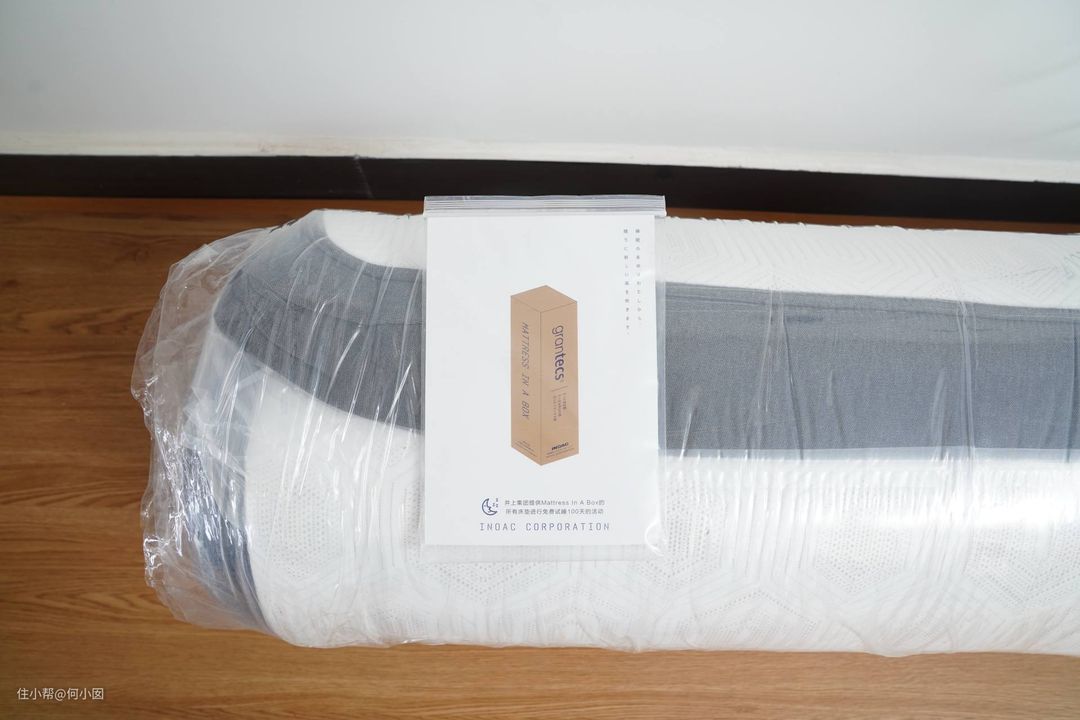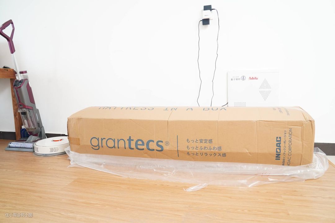 纸箱上有grantecs的英文名和日文井上的标志,我一个人艰难的把纸箱打开了,这里建议最好是两个人操作,一个人还是比较难的,虽然床垫被压缩成了体积不大的一个卷卷,但是密度和重量还是在那里的,很重