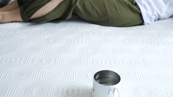 如果这个图觉得不明显,那看下面一张动图,我放了一杯水在床上,然后在水杯旁边翻身,可以明显的看到,水杯略有震动但是水完全不会溢出,我这么重的翻身,杯子的震动都是比较小的