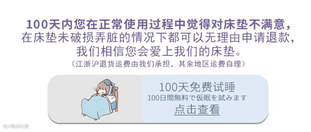 我一下子就感兴趣了,睡3个多月,如果还不知道喜不喜欢恐怕不是床垫的问题,是我的问题了!最最最让我心动的是,居然江浙沪地区包退货运费!虽然我可能不会退货,但是看看这个品牌的诚意,真的是实实在在,如果100天试睡不满意,对江浙沪地区的小伙伴来说,就是完全0费用