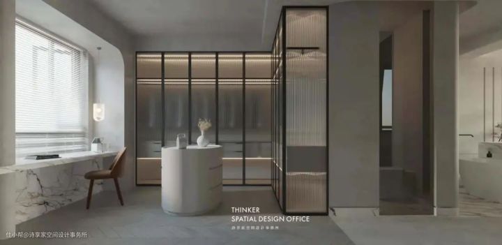 · 步入式衣帽间以长虹玻璃代替实体木板,空间平添几分纯净通透,灯带设计方便衣物拿取的同时,仪式感十足,来到这里就像来到了一家专属奢侈品店。