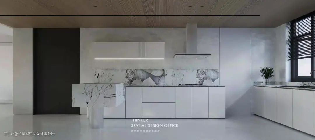 · 简洁设计,打破大众对厨房拥杂逼仄的刻板印象,大理石花纹让厨房品质感十足,灯带点缀增加灵动与诗意气息。通透的空间让阳光与空气在室内自然流淌,简单的设计蕴含细腻心思。
