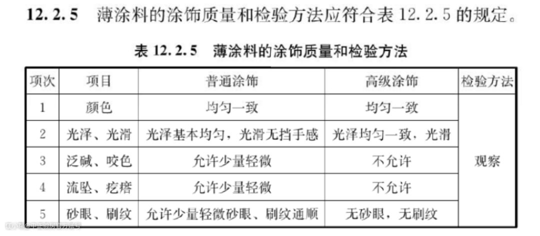 12.2.3 水性涂料涂饰工程应涂饰均匀、粘结牢固,不得漏涂、透底、开裂、起皮和掉粉。