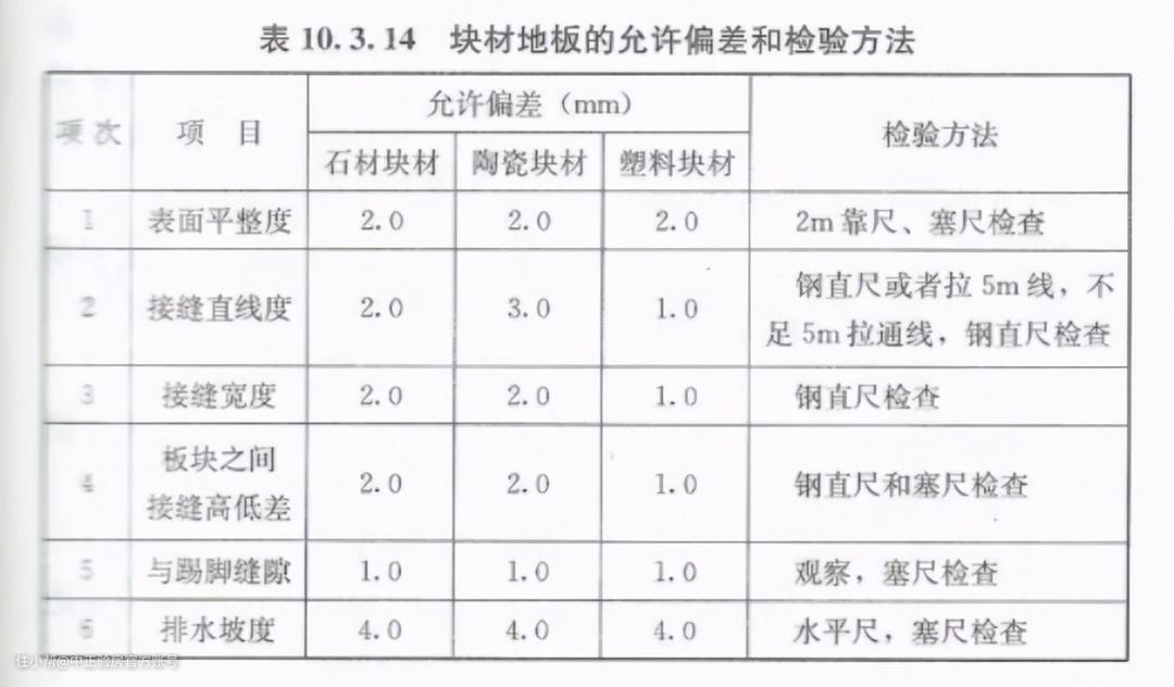 10.3.13 块材地板面层的排水坡度应符合设计要求,并不应倒竣、积水;与地漏(管道)结合处应严密牢固,无渗漏。