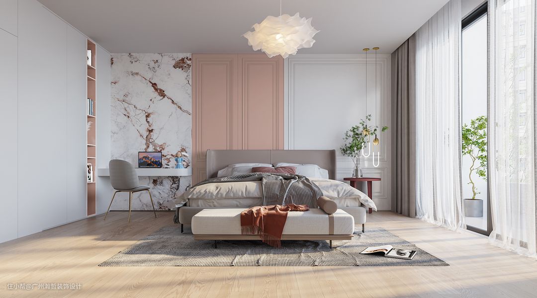卧室的氛围静谧舒适,让人卸下一天的疲惫。床头背景用浅色格栅板搭配潘多拉岩板,既呼应了整个家的风格定位,也让房间颇具层次感,增加空间的灵动性。