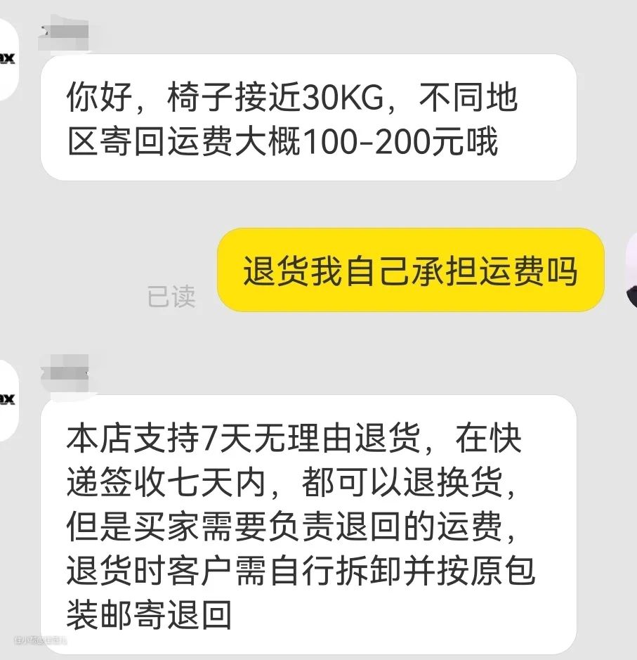 他默默查了下物流,将近30kg的人体工学椅,从北京退回浙江,运费将近200元,而且需要把人体工学椅各部分都拆开,装到原来的包装箱里。