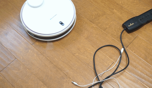 充电座和其他品牌的看着差异并不是很大,不过纯白色机身加黑色元素,显得更干净,也更有科技感。当然,不仅仅是外观,其实在底部还隐藏着个小玄机,原来底部设计了电线收纳仓,很多时候我们电源线太长,拖在外面又比较难看。而蓝宝扫地机器人的充电座,其实还是一个电源线收纳盒,完美解决电线太长的问题。