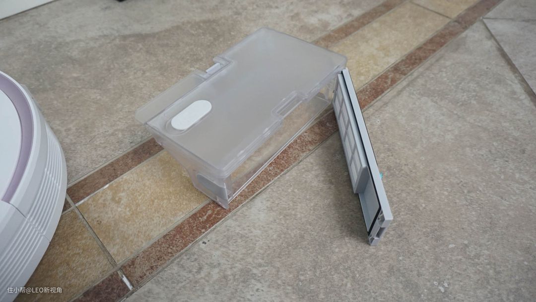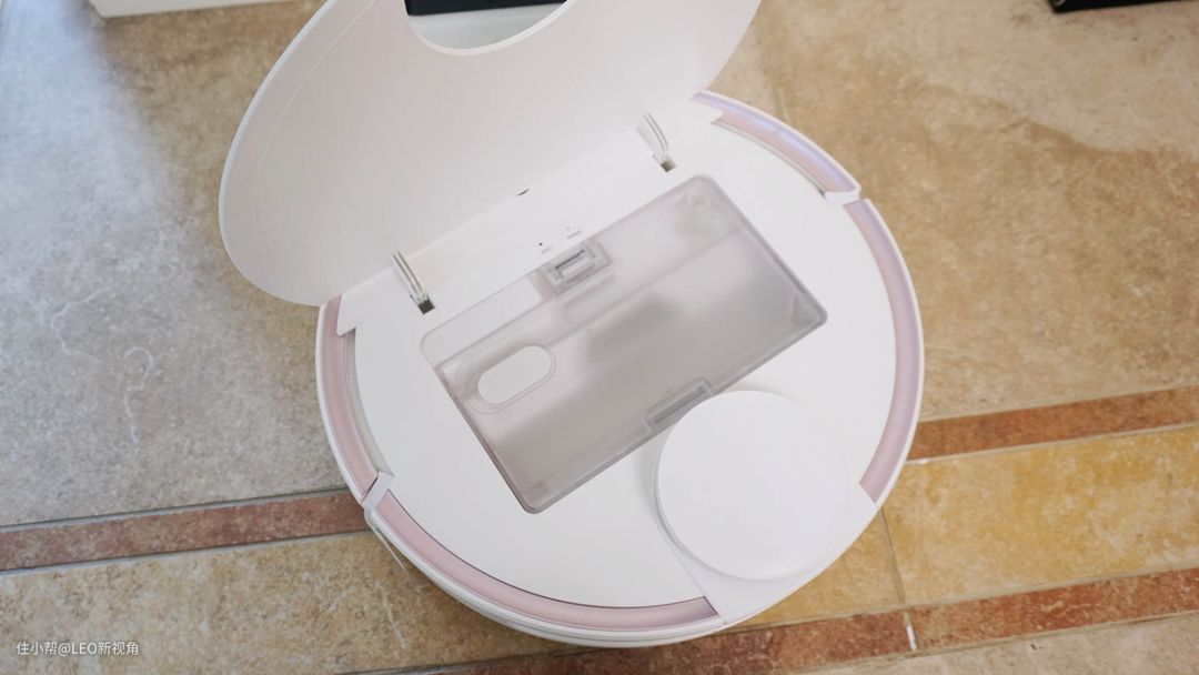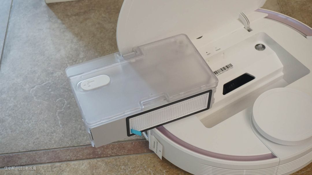打开盖子,可以看到wifi指示灯和工作指示灯,以及一个“巨大”的尘盒。这个尘盒和普通扫地机器人不同,还是一个二合一的设计。它是一个400ml 的尘盒+200ml的水箱,以往类似的扫地机器人因为结构设计,水箱的容量往往不够大, 一次下来,拖地时到后面基本没有水了,就需要经常换水,而有了这个水箱设计,用水量就足够了。