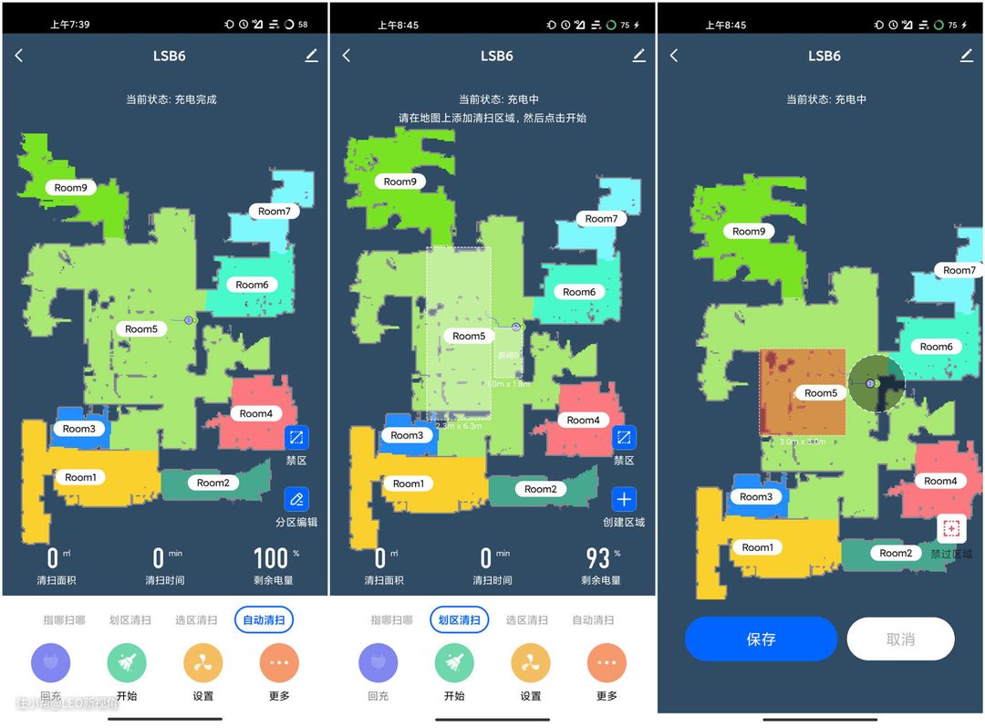 在第一次完成建图后,会自动划分区域,而且每个区域都会用不同的颜色表示,可以让用户一目了然,如果部分区域需要重新定位划分,则可以将区域合并或者拆分。另外,清扫时可以去指定区域,也可以自定义划区清扫,对于一些不想让扫地机器人清扫的区域,或者是拖地模式下地毯区域,则可以设置禁区。