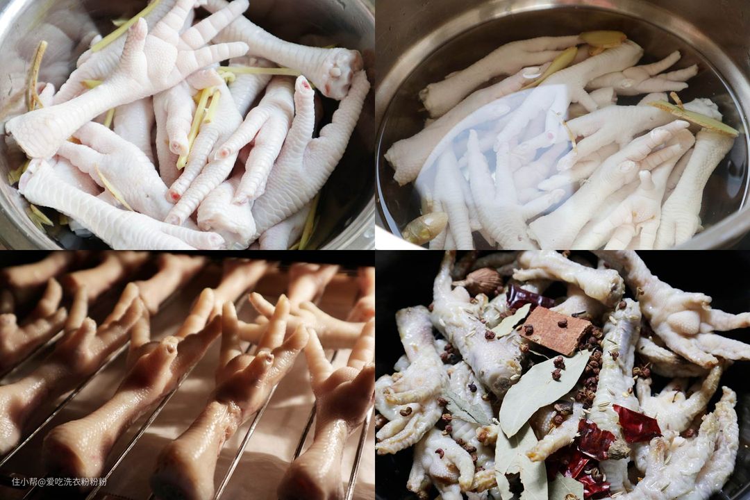 把鸡爪子清洗干净剪掉指甲,然后用姜丝料酒腌制一会,之后就冷水下锅撇去浮沫,晾干后就是用烤箱正反面各烤40分钟,省掉油炸这个步骤又健康又省事儿,剩下的嘛,就是加料开煮了!