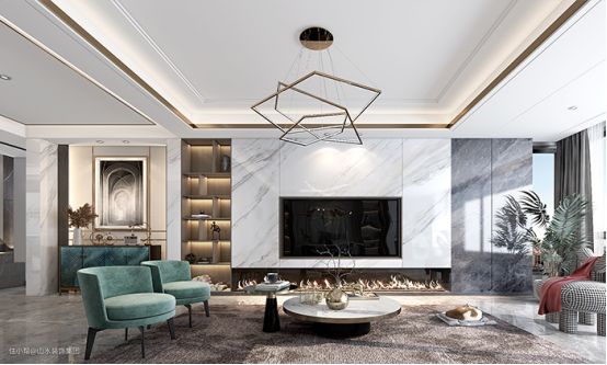 现代轻奢风格中,大理石瓷砖+金属元素,在利用石膏线勾勒空间,是最常见的材料搭配。这种搭配于简约时尚中注入了一抹优雅、精致,不仅轻松演绎出现代轻奢的独特魅力,而且缔造出了高品质家居空间,避免了千篇一律的色调与呆板。