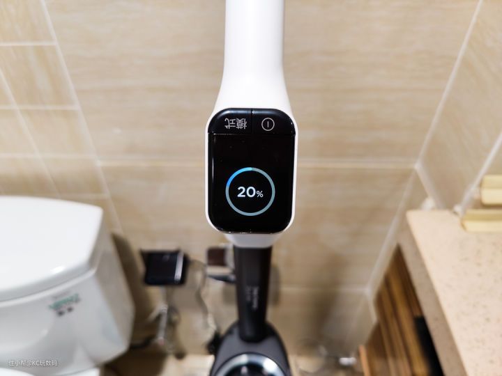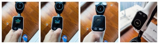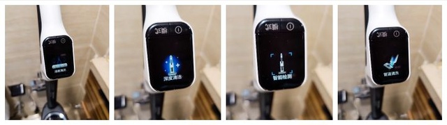 美的智能除菌 X8 洗地机手柄的顶部是一块 LCD 彩屏,整机的状态、模式切换、自清洁时具体的步骤、常见的报错/提示(缺水、水箱满)等信息都会显示在屏幕上,并且屏幕显示内容还会根据使用的状态自动进行翻转。