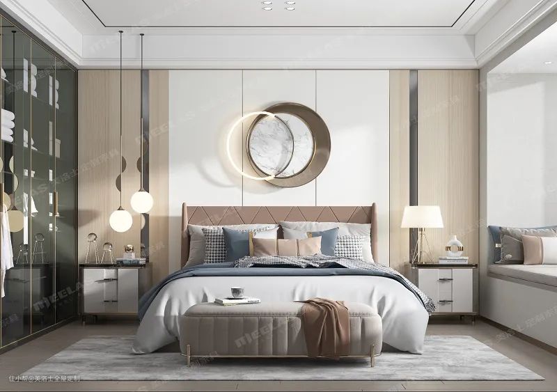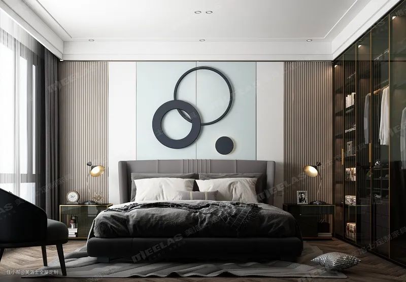 在护墙板背景墙的基础上,在墙面上装上一些立体感的金属质装饰品,会让卧室显得更加时尚。
