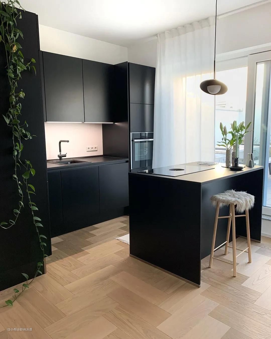 一个超简约设计的全黑厨房,现代风格棱角感的线条与几何平面,黑色整装橱柜透露出科技感,散发出冷静的空间魅力。