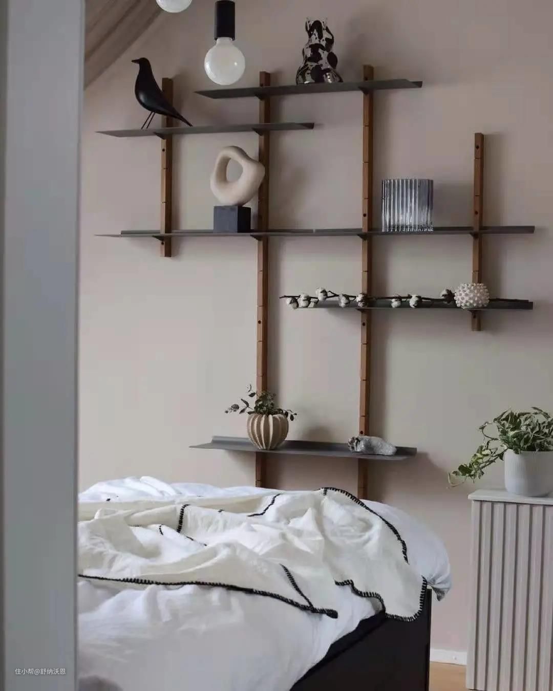 墙上的几何置物架是屋主自己动手制作的,放上小盆栽和艺术摆件,不仅增加了收纳空间,也让单调的墙面更好看。