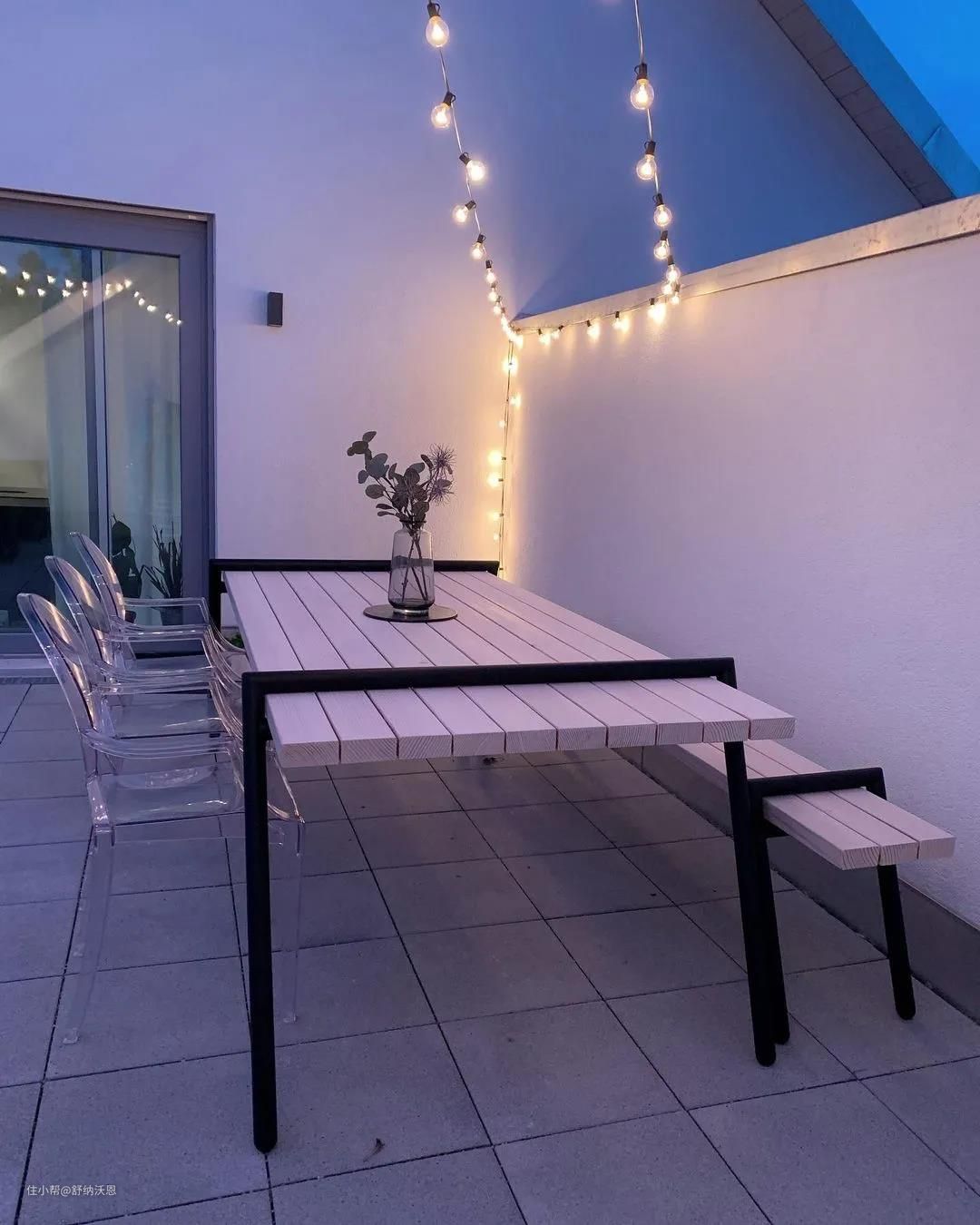 与客厅相连的露台则承担了另外的功能,星星一样的氛围灯,加上长餐桌,简直是派对狂欢的绝佳地点,可以作为户外餐厅,也可以作为吧台使用,总之有了它,夜晚绝不会不会无聊度过。