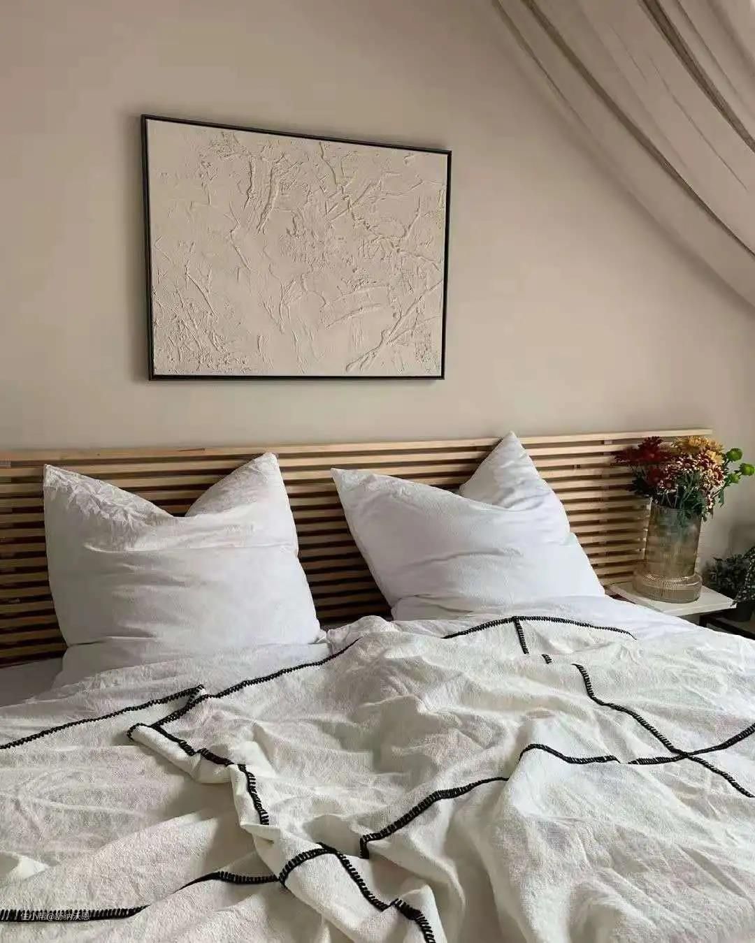 卧室同样是斜屋顶,比起单调冷静的白,屋主用了天鹅堡系列的羊毛米来为房间增添舒服的睡眠氛围,温暖的棕色仿佛柔软的羊毛 ,让人在放松的环境里安静入睡。