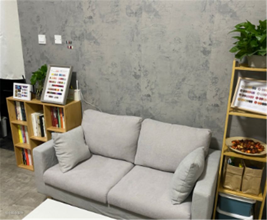 客厅内墙面和地面保持原始水泥风貌,自然统一;一侧摆放了小沙发和茶几,两侧的小置物架用于收纳物品,客厅看上去利落整洁。