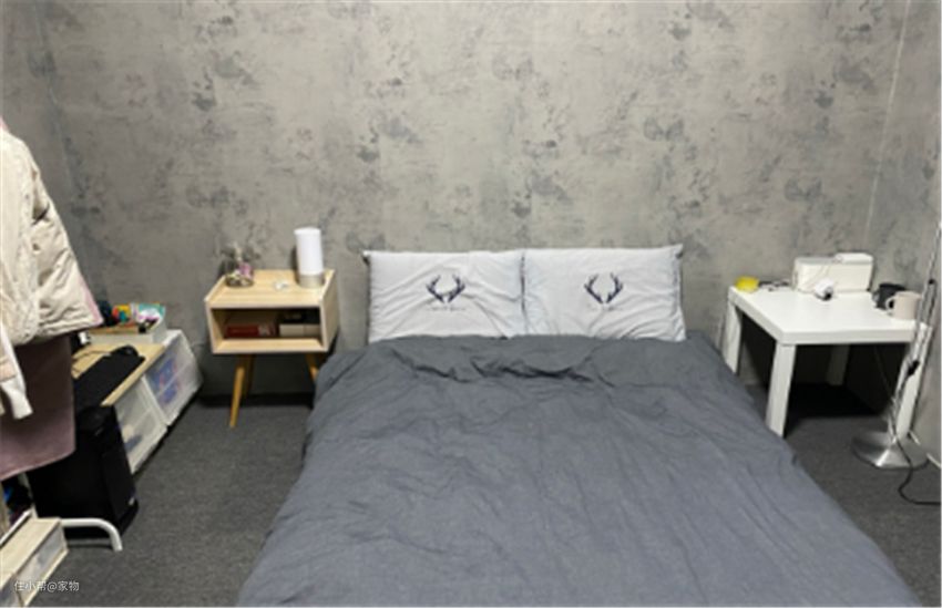 卧室内设计也很简单,墙面是灰色的壁纸,地面铺设了地毯,缓解了毛坯房的冷硬,没有放床,仅一个床垫,不过一人用足够;四周摆放了小型衣柜和方桌,满足储物。