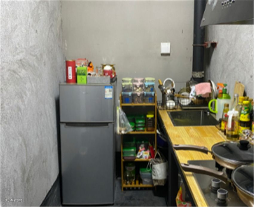 厨房仅安装了油烟机和水槽,用一个长桌替代了橱柜,角落放置了小冰箱,小巧可爱。台面被收拾的干干净净,格外清爽。