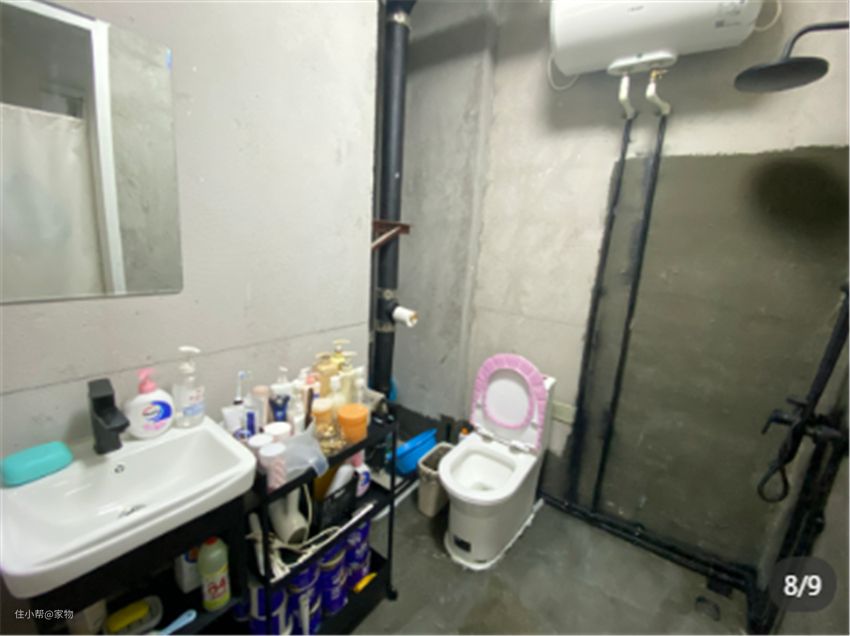 卫生间面积不大,墙面水泥略显粗旷,但各种卫浴设备都很齐全,零散物品有序收纳在小推车上,小却舒适。