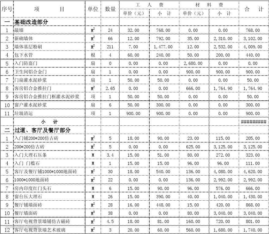 以毛坯房装修为例,报价单是由施工项目、数量、单价、工艺、主材、辅材、型号、规格、总价等等部分总成。完整的报价单以上这些项目,都应事无巨细一一列清。