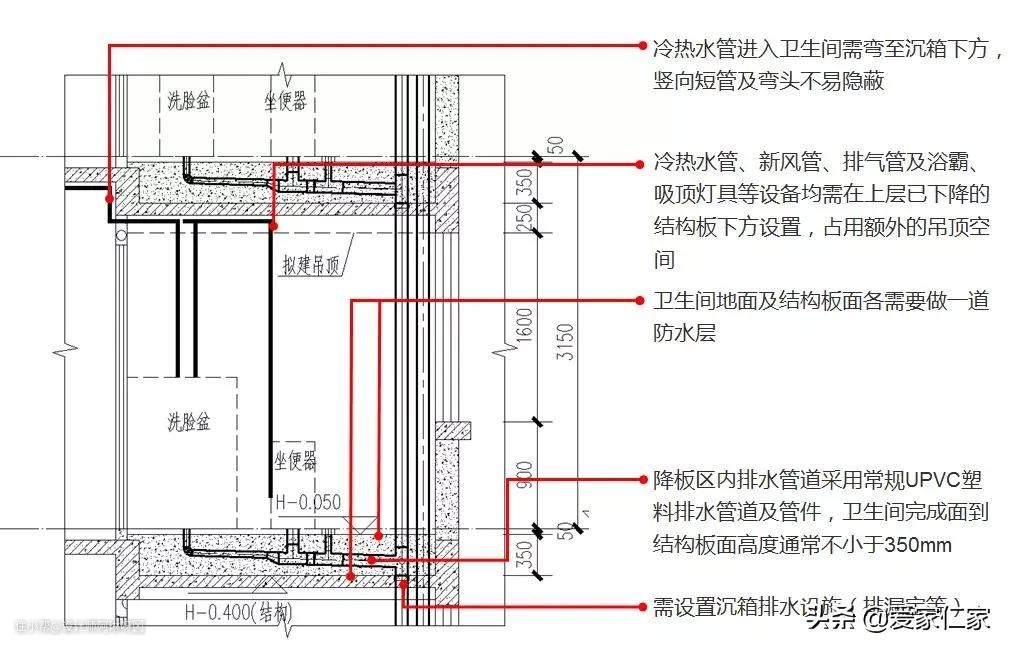 传统全降板即卫生间楼板整体下降,本层冷热水管、浴霸等管道设备需在上层下降的卫生间楼板下方设置,影响本层卫生间实际可使用净高。